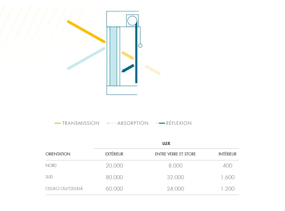 Lorsque la lumière atteint une surface, une partie traverse (transmission) les matériaux existants (qu’il s’agisse d’une surface vitrée ou d’un rideau), une autre partie est réfléchie vers l’extérieur (réflexion) et le reste de la lumière est absorbé par le tissu, puis irradié sous forme de chaleur (absorption).