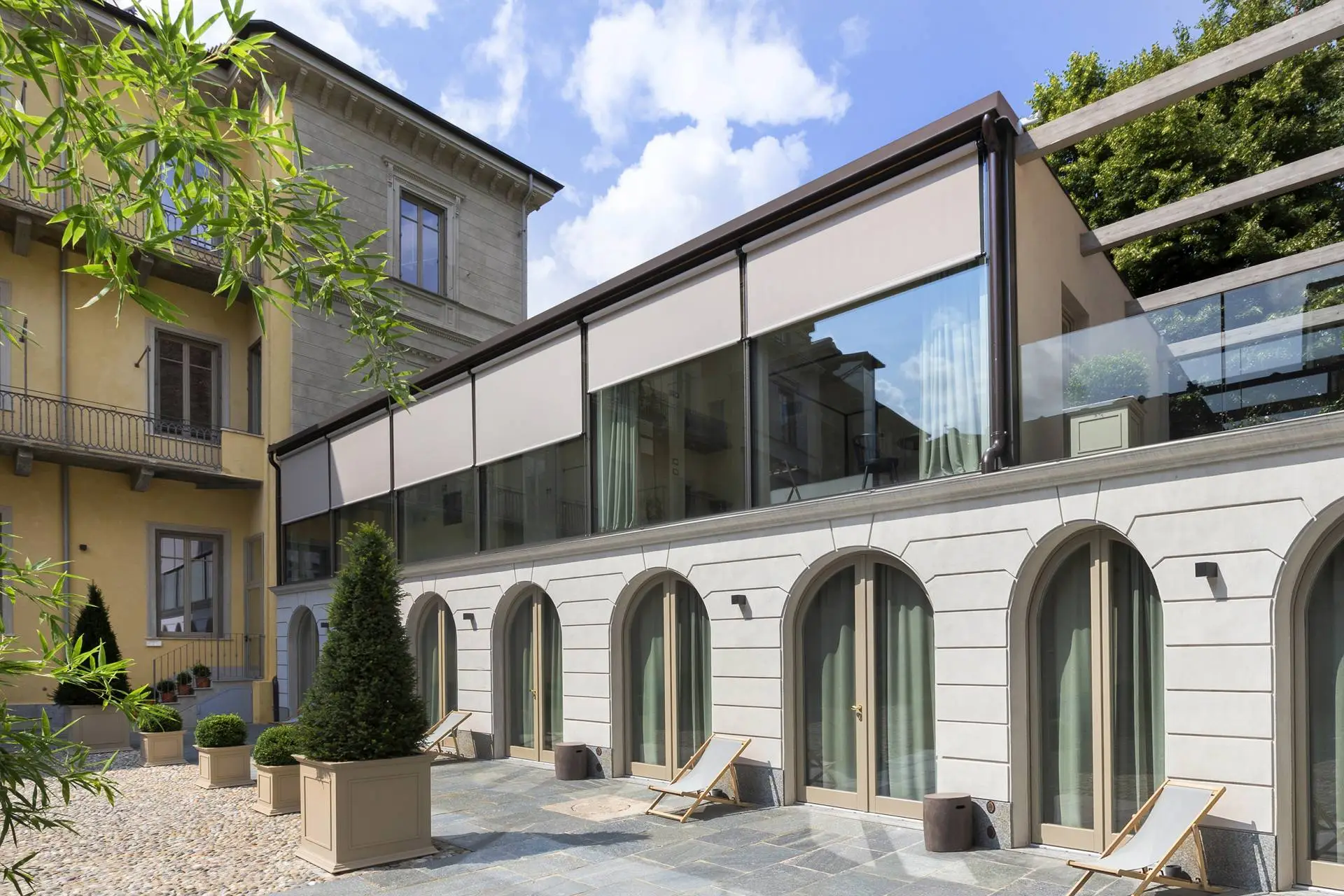 En raison de son emplacement, de larges vues sur le jardin et la cour créent un besoin de solutions de contrôle solaire.